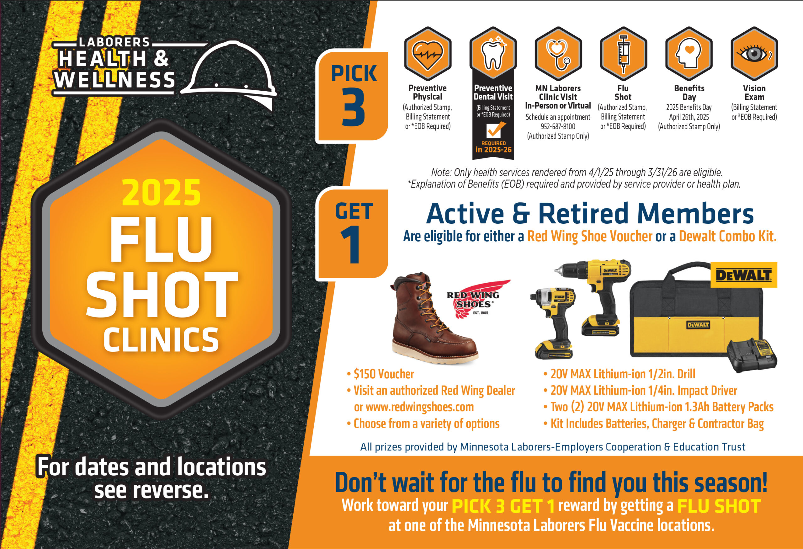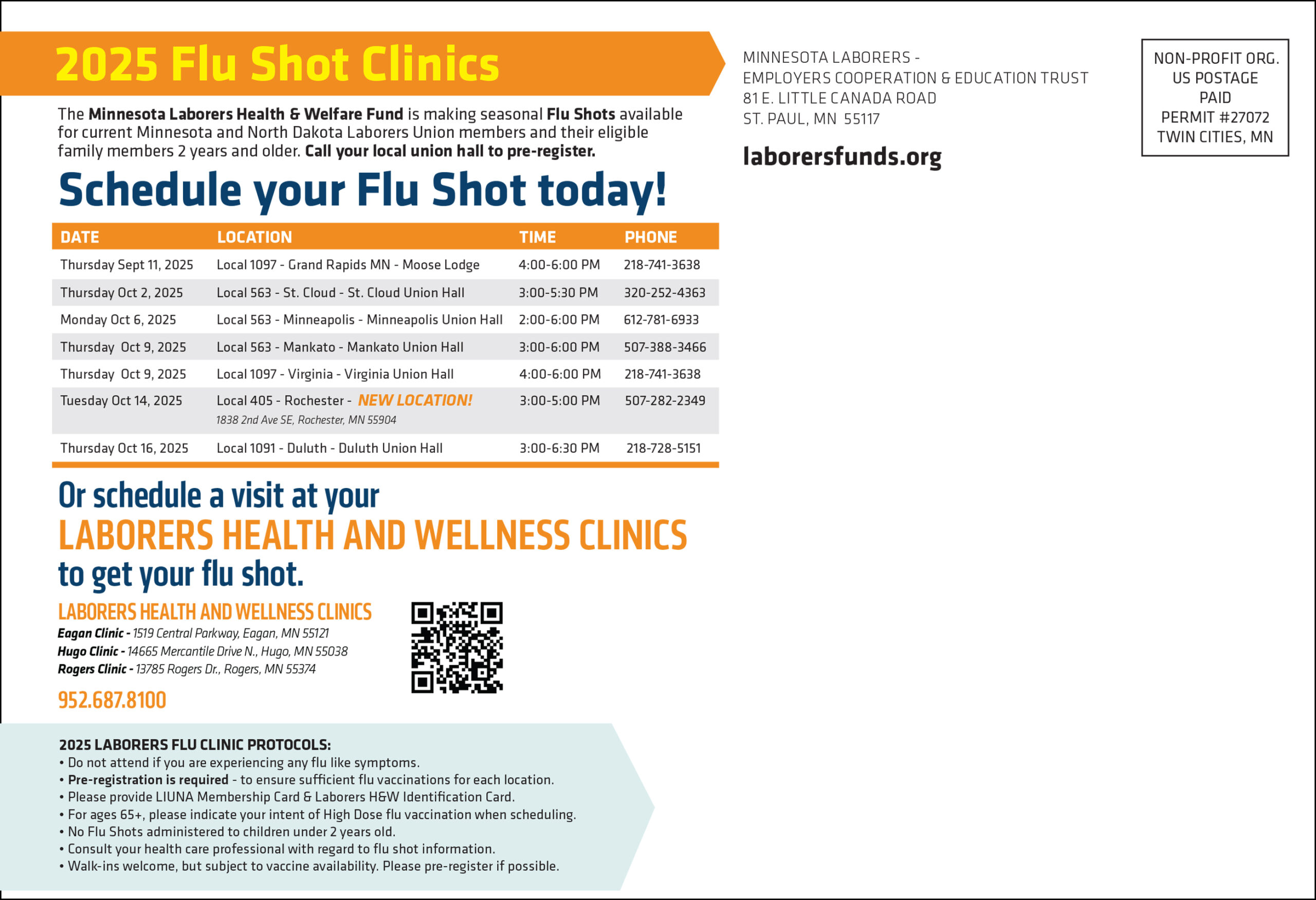 The Minnesota Laborers Health & Welfare Fund is making Seasonal Flu Shots available for current Minnesota and North Dakota Laborers Union members and their eligible family members 2 years and older. Call your local union hall to pre-register.