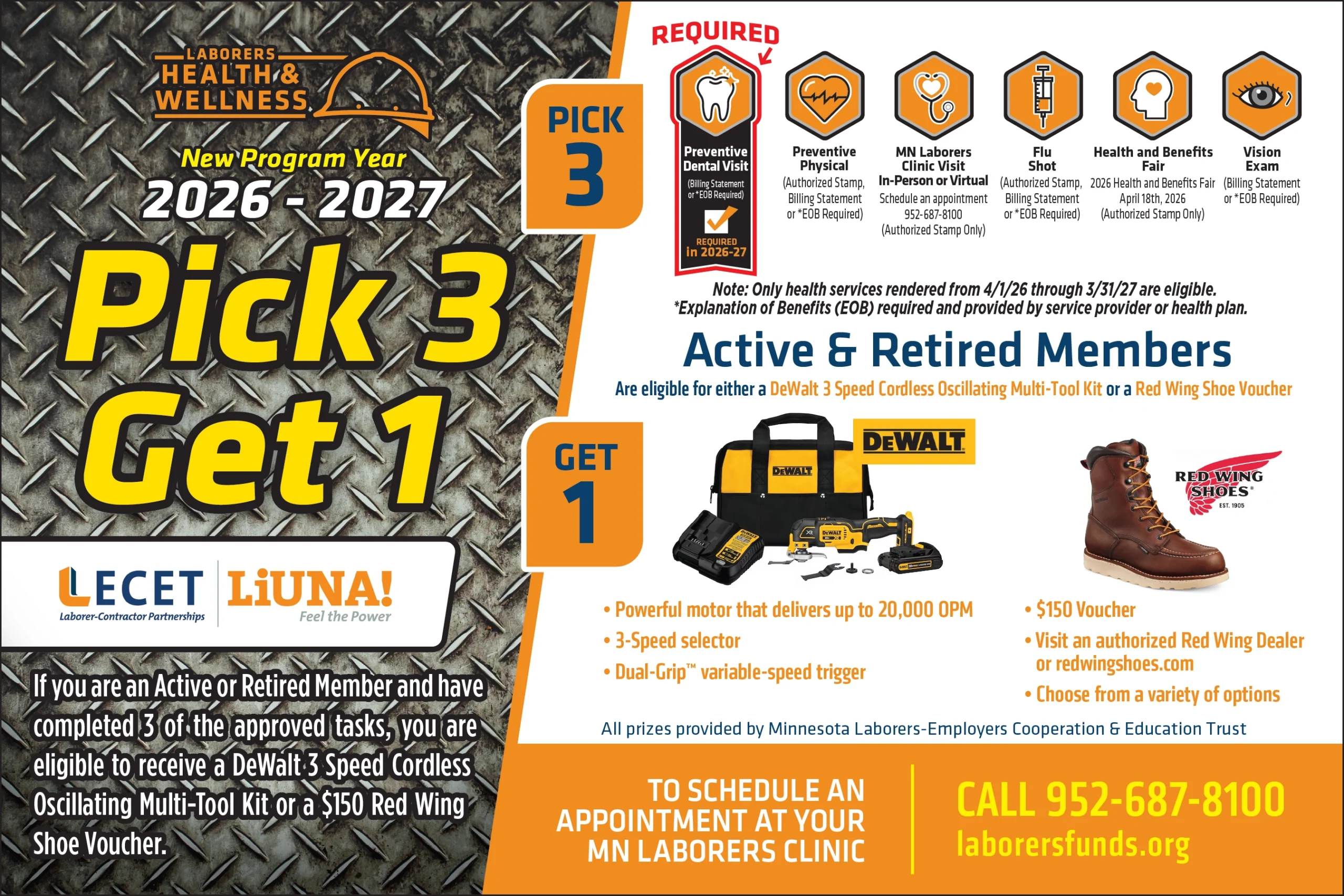 Preventive Physical Preventive Dental Visit (Required) Clinic Visit In-person or Virtual at a MN Laborers Health and Wellness Clinic. Flu Shot Attending the Health and Benefits Fair April 18, 2026 Vision Exam